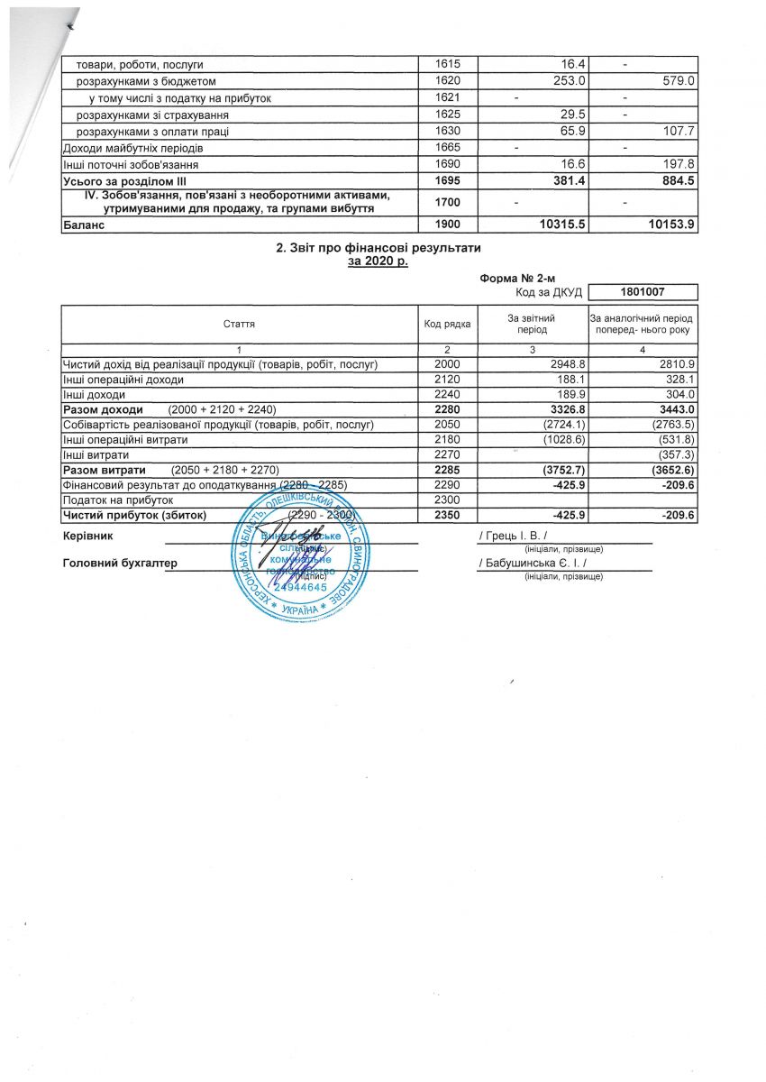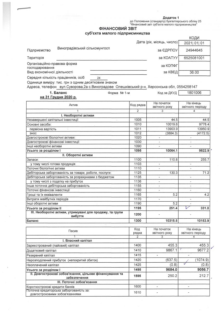 Фінансовий звіт Виноградівського сільського комунального господарства за 2020 рік